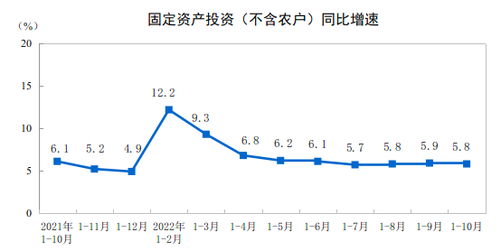 1-10月份,全国固定资产投资(不含农户)471459亿元,同比增长5.8%。其中,民间固定资产投资258413亿元,同比增长1.6%。从环比看,10月份固定资产投资(不含农户)增长0.12%。